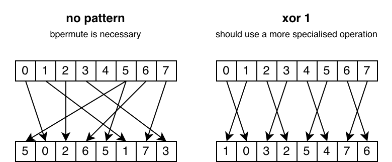 To illustrate the difference between shuffles that need bpermute and shuffles that can be executed using DPP, the following diagram shows a complex example of where bpermute would be necessary, contrasted with a case that can be optimized with DPP: