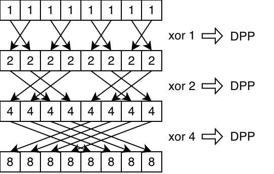 The performance of the example above would be significantly improved if the whole computation could be executed while staying within the registers. AMD GPUs have hardware features (including DPP) that can do restricted kinds of permutation an order of magnitude faster. We just need to implement some compiler magic to enable permutations to be compiled to DPP.