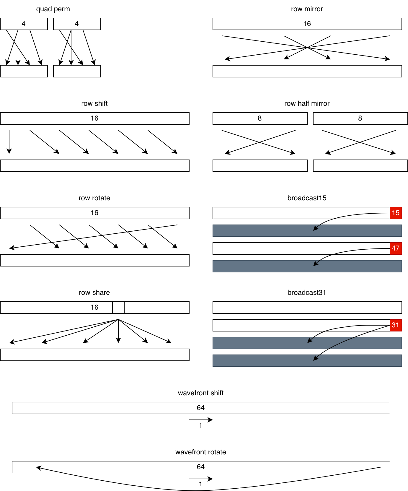 - wavefront rotate: like the above, but the last lane's data goes to the first lane (or vice versa)