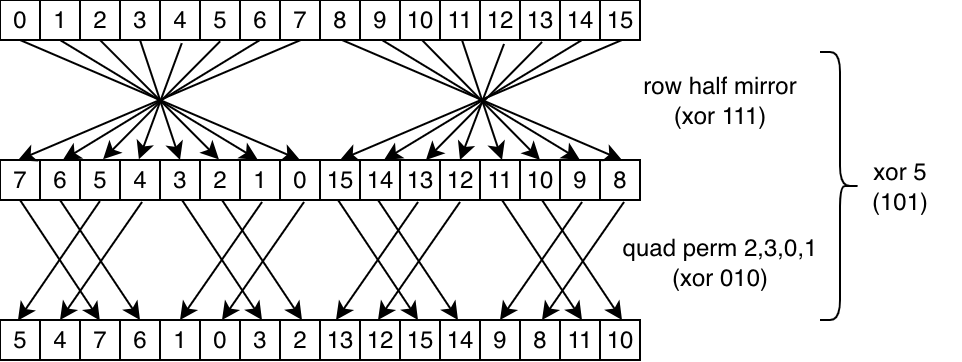 For example, the XOR pattern isn't supported on all architectures, but we can build it using a combination of quad perm, row mirror, and row half mirror. Here's how we would do XOR 5: